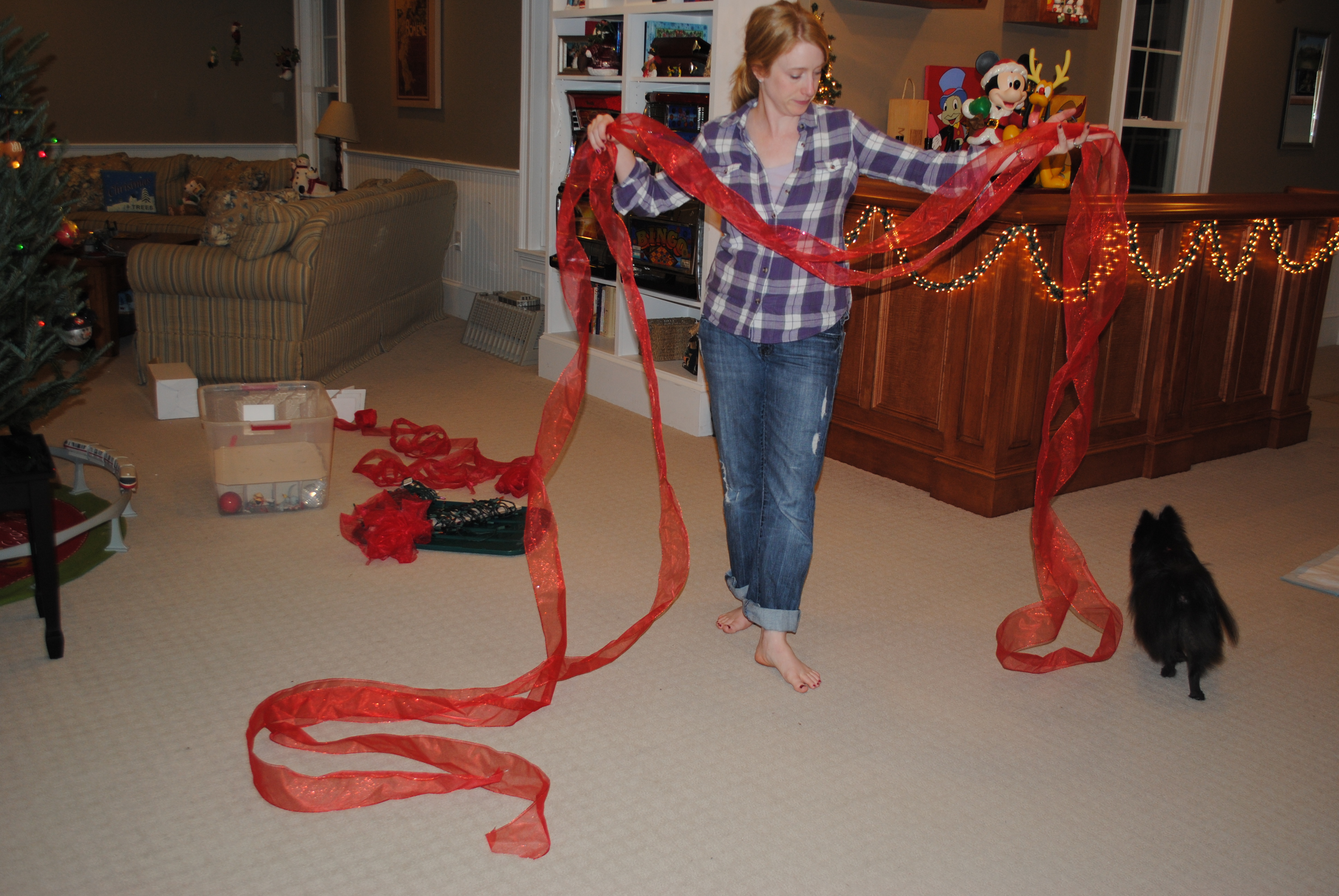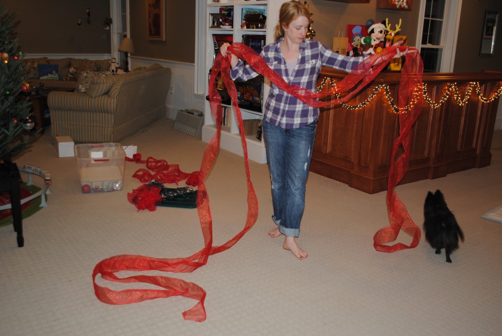 It’s such a simple way to spruce up your tree and add another dimension to your decorating. Start by unraveling an entire roll of wired ribbon and find the center point. (My sister-in-law’s dog Tia was clearly a huge help!)