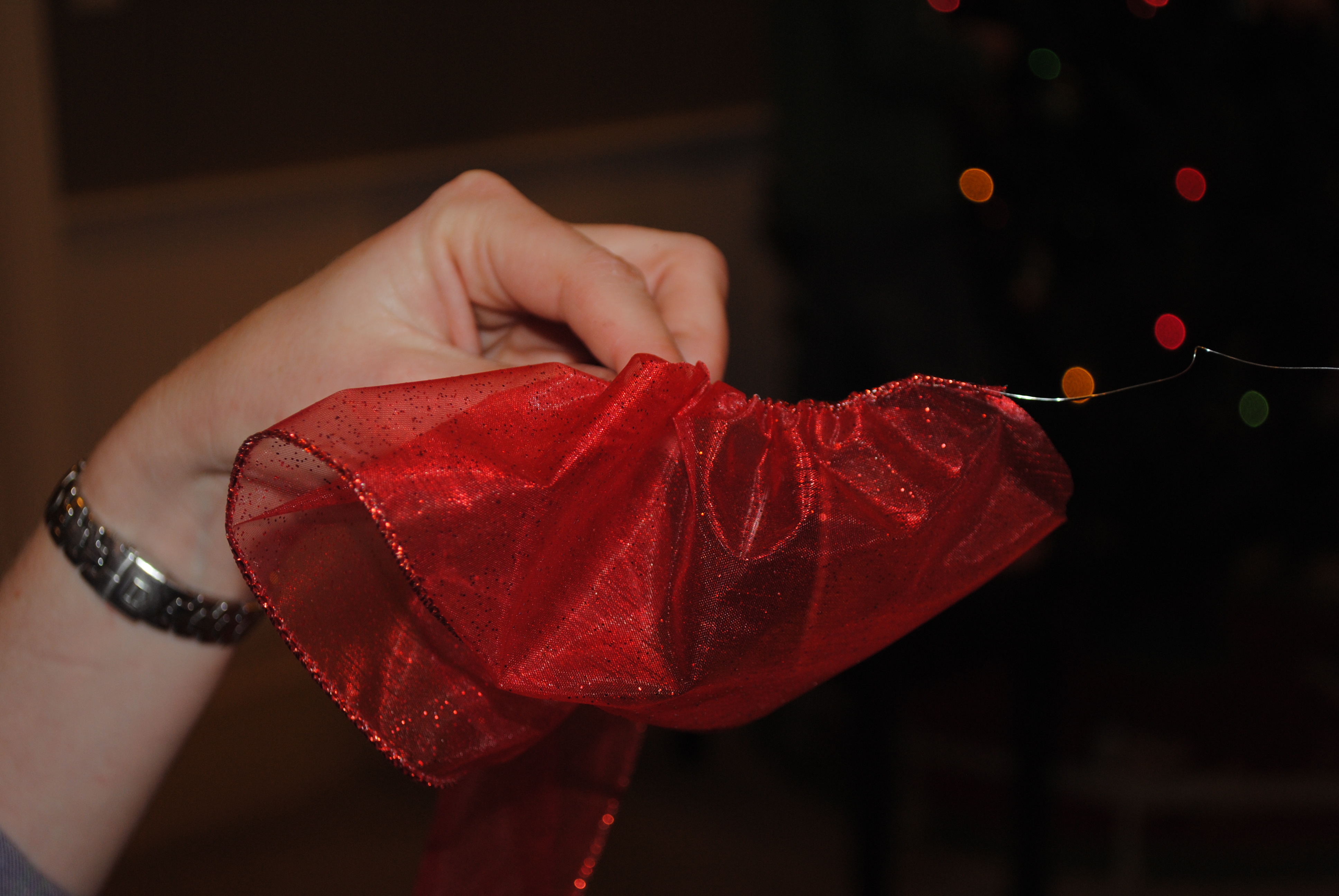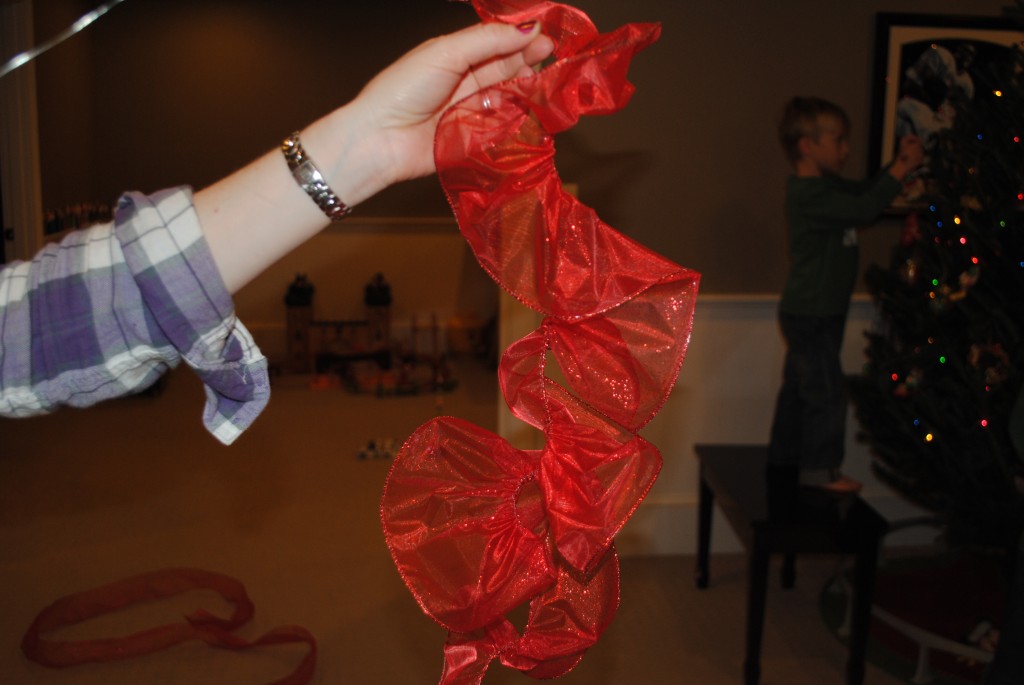 You’ll be left with a whole lotta wire at the ends of your ribbon…I just made a little knot and snipped off the rest. Once it is complete, start from the top and wrap it around your whole tree!