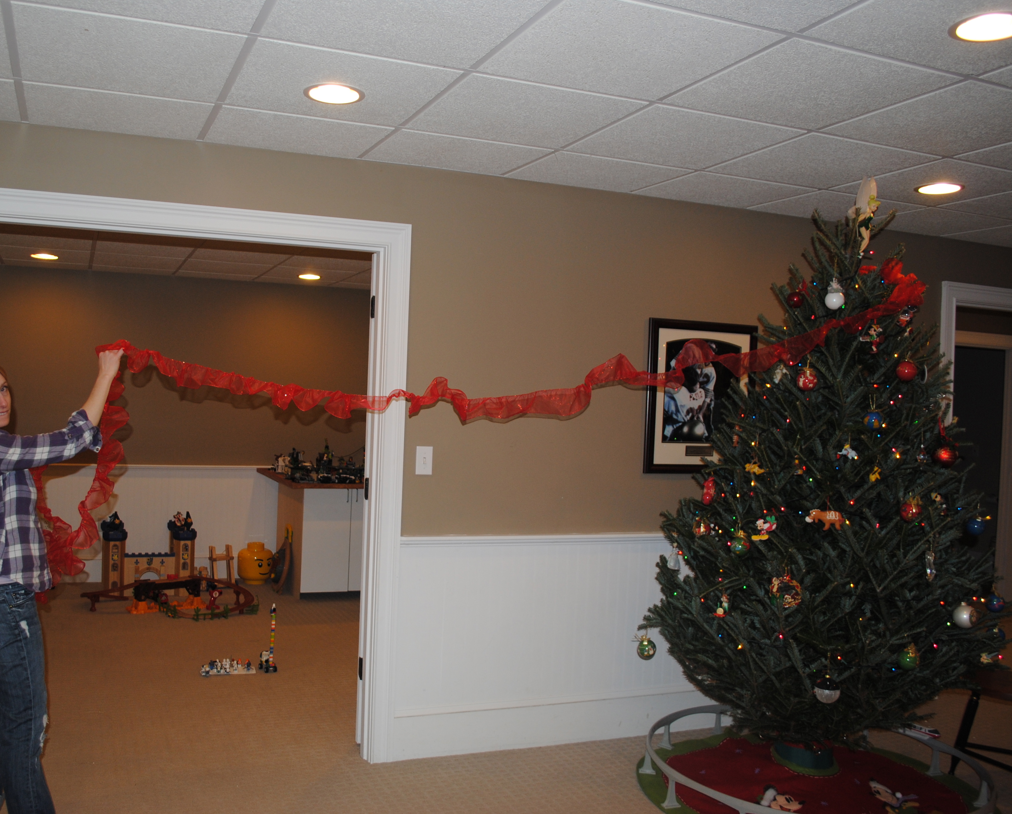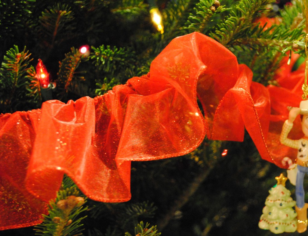 I am aways looking for new ways to spruce up one of our many Christmas trees. In the basement we have a Disney themed tree (with, you guessed it, Tinkerbell at the top) This is, by far, the tree my kids enjoy decorating the most! They get free reign to decorate it however they want (which usually means that all the ornaments are clustered to one section close to the bottom, but not this year, my 7 year old finally figured it out and undecorated behind my 4 year old) and when they are done, I come in and add some decorative ribbon around the tree. This year I discovered a fabulous new trick with the help of Sarah from Ace Hardware in Acton – RUFFLED RIBBON!
