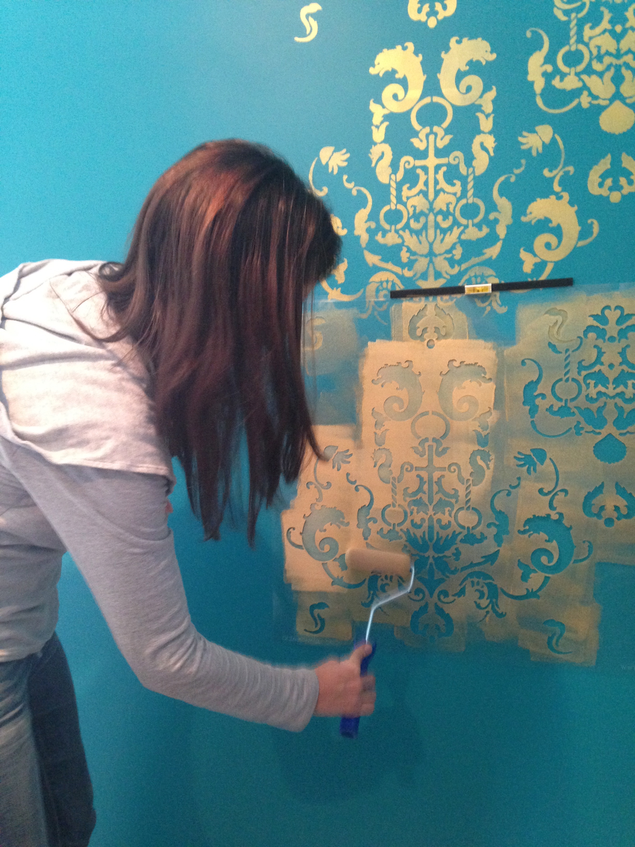 Since wallpaper wan’t in the budget, we brought in this stencil with gold metallic paint.  My client and her family spend lots of time at the beach, so this nautical stencil with an anchor and dolphins was the perfect choice.  I am dying over the gold and teal combo!